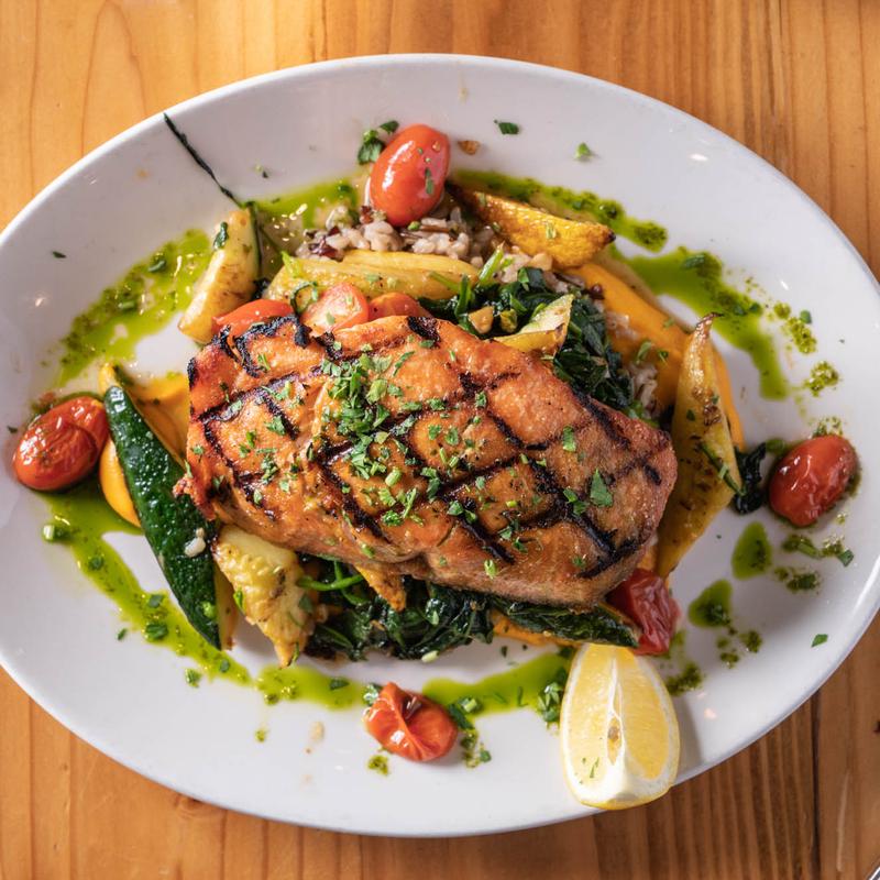 Grilled chicken breast, lemon, capers and garlic in a Chardonnay beurre blanc served with mashed potatoes and sautéed mixed veggies
